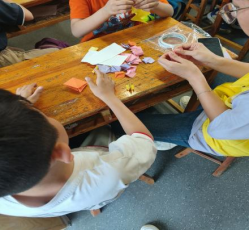 本期“垃圾分类,变废为宝”手工小课堂的教学内容是“手工青蛙”。志愿者老师认真细致地讲解手工折纸的由来及制作方法,给大家演示并讲解了基础折纸的方式和技巧,及如何运用不同的方法做成长方形、正方形、菱形、三角形等不同图形等。参与困难的小朋友在志愿者的协助下,一步步跟着讲解进行折叠,慢慢地从最初的生疏到熟练,充分发挥着自己的动手能力,将正正方方的七彩纸对边折、对角折、四角向中心折,一步步折叠起来,通过折叠,将一张平面的纸变成一个立体的青蛙,很快一个个“活蹦乱跳的青蛙"作品就制作完成了。大家开心地向身旁的伙伴们展示成果,还兴奋的要比赛看看谁的青蛙跳的远,每个人脸上都洋溢着兴奋。