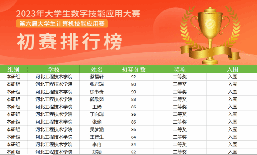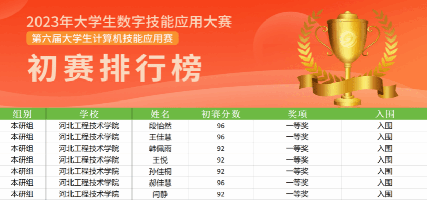 本次比赛分为程序设计和办公软件两个赛道,我院在全国本研组预赛中共获得7个一等奖、24个二等奖、29个三等奖,同比去年1个一等奖、7个二等奖再创历史新高。其中我院段怡然、王佳慧、韩佩雨、王悦、孙佳桐、郝佳慧、闫静7名同学披荆斩棘获得大赛本研组一等奖;蔡福轩、张君瑞、徐书奇、郭欣茹、王烯、丁向瑞、张瑜、吴梦涵、王智生、李冉、郑颖等24人获得大赛本研组二等奖。