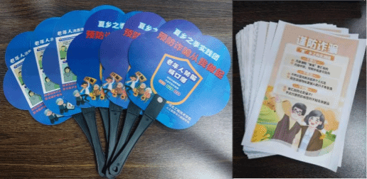 随着时代的飞速发展,电线诈骗的手段也不短“升级”,面对诈骗,老年人的防范意识相对薄弱,夏乡之季实践团通过防诈宣传单等,向口诀印在老年人普及诈骗的手段,以及防诈骗的小口诀,通过将防诈口诀印在日常生活中会用到的扇子上,来将防诈浸透在老年人的日常生活中。