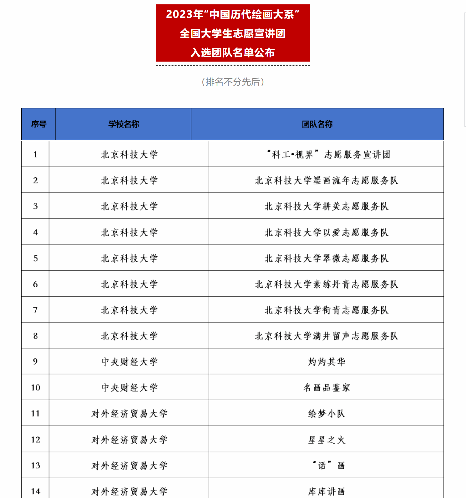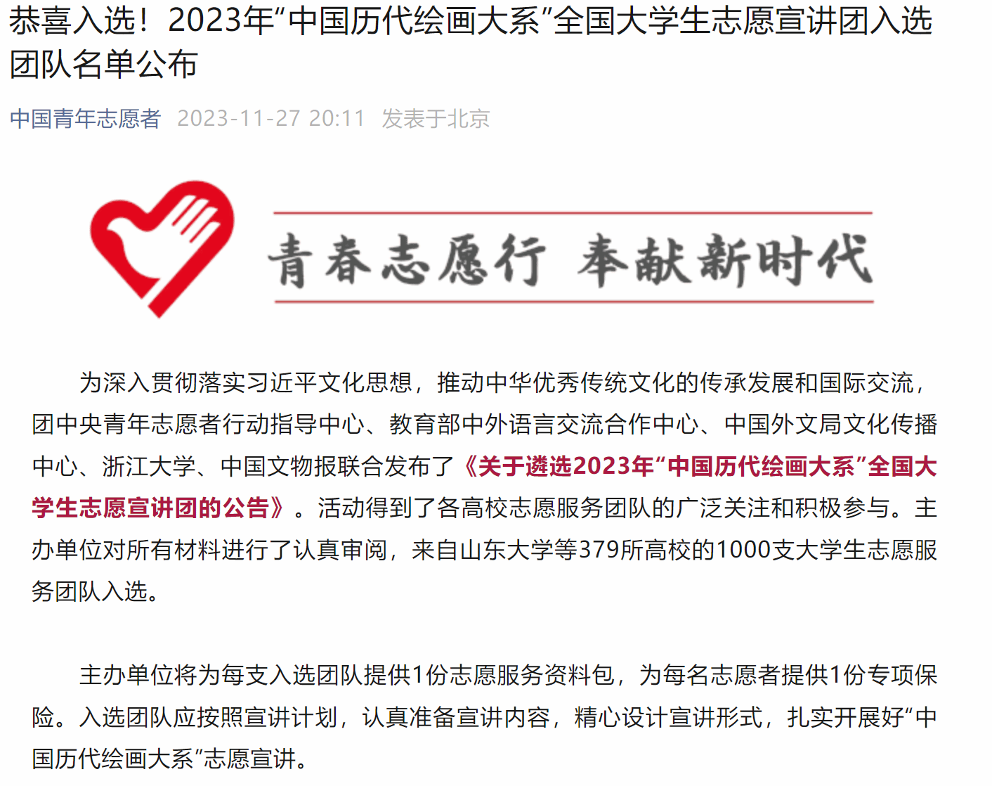由团中央青年志愿者行动指导中心、教育部中外语言交流合作中心、中国外文局文化传播中心、浙江大学、中国文物报联合发布了《关于遴选2023年“中国历代绘画大系”全国大学生志愿宣讲团的公告》。我院“小智公益团队”和“心理健康协会团队”成功入选全国1000支大学生志愿服务团队。