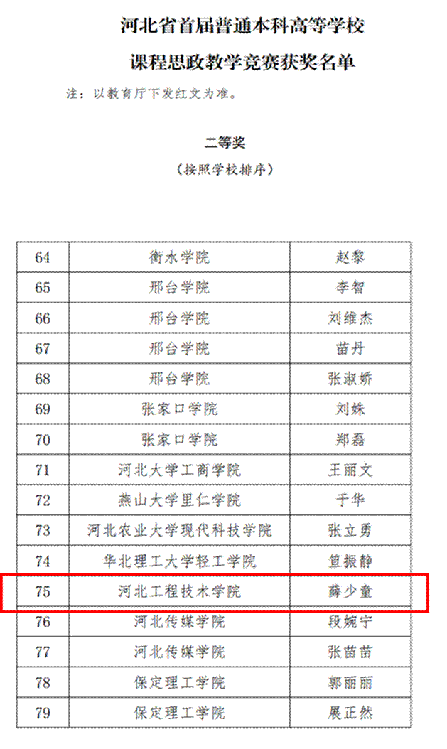 近日,河北省首届本科高校课程思政教学竞赛圆满落幕。竞赛自3月17日启动,为期两天,我院薛少童老师历经校赛、省赛半决赛、省赛决赛等环节,最终获得二等奖。