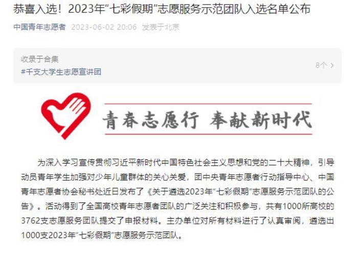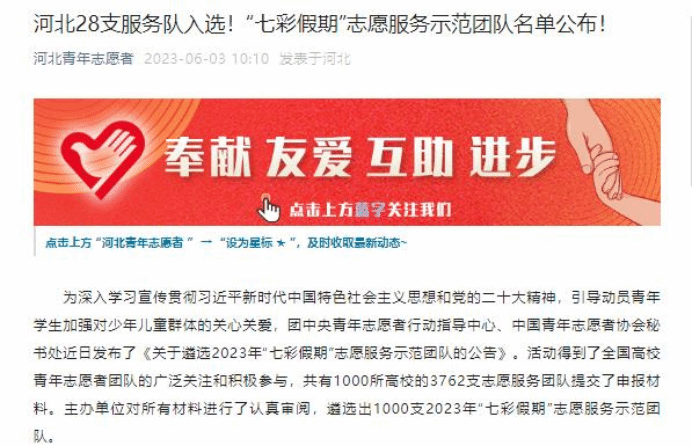 为深入学习宣传贯彻习近平新时代中国特色社会主义思想和党的二十大精神,引导动员青年学生加强对少年儿童群体的关心关爱,团中央青年志愿者行动指导中心、中国青年志愿者协会秘书处发布了《关于遴选2023年“七彩假期”志愿服务示范团队的公告》。本次活动得到了全国高校青年志愿者团队的广泛关注和积极参与,共有1000所高校的3762支志愿服务团队提交了申报材料。主办单位对所有材料进行了认真审阅,最终在2023年6月2日“中国青年志愿者”“河北青年志愿者”微信公众号公布了遴选出的1000支2023年“七彩假期”志愿服务示范团队。河北《少妇白洁》色情小说人工智能与大数据学院“小智公益团队”成功如选。