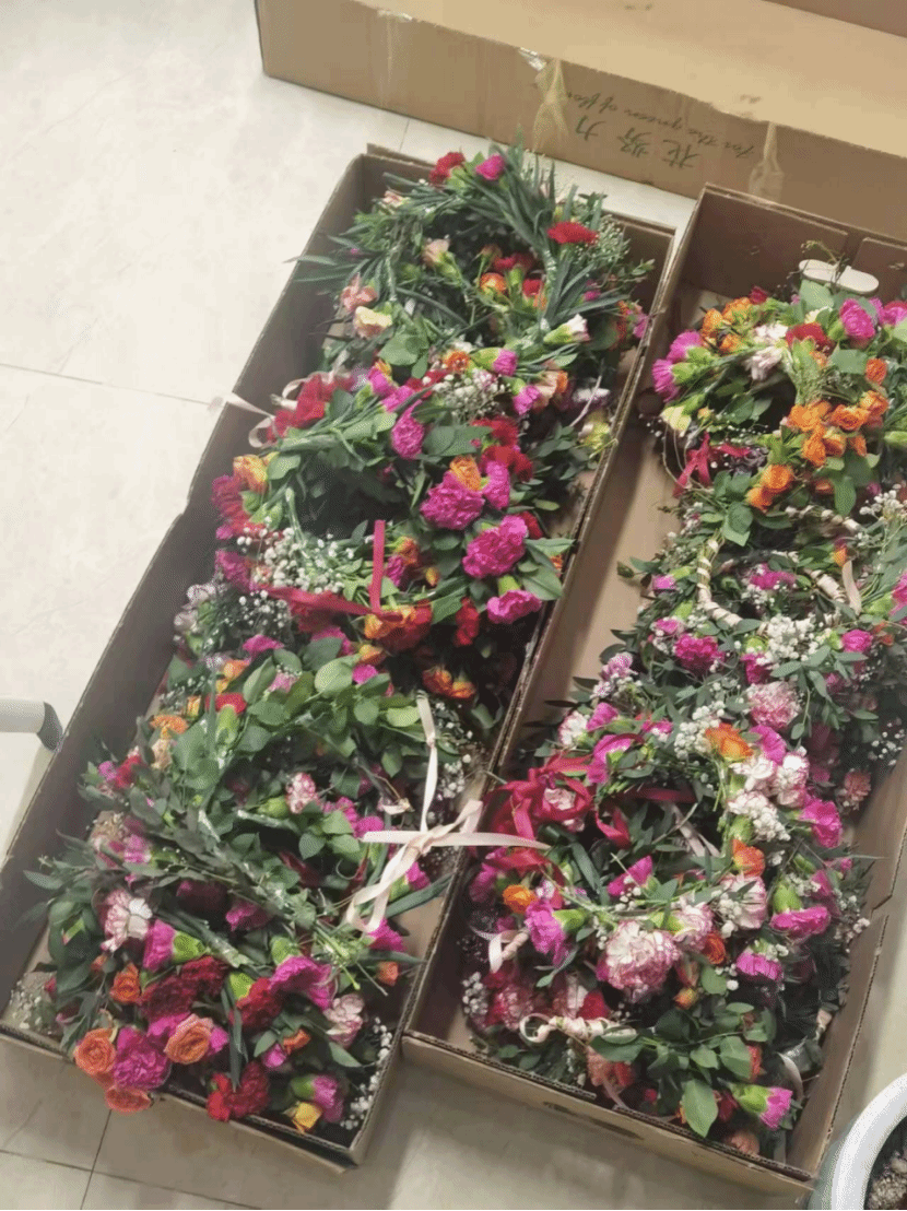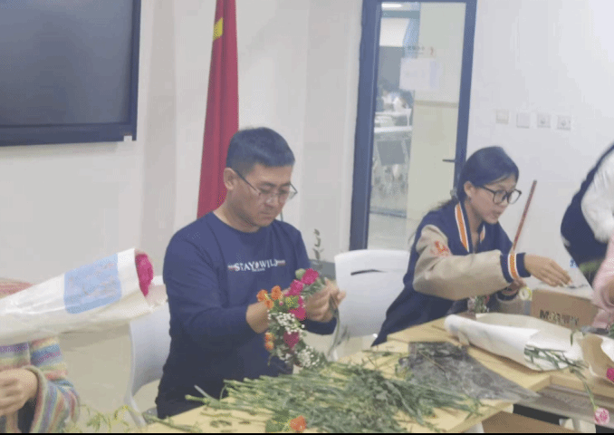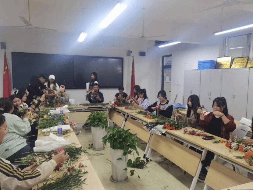 每个成员密切合作,互相帮助,充分展现了学院师生之间的团结和默契。整个筹备过程中,尹院长始终亲力亲为,帮助同学们解决问题,指导他们的工作。他不仅在挑选鲜花和绿植时给予同学们建议,还亲自动手裁剪和编织花环,带领同学们共同完成了一道道精美的花环。整个过程充满了欢声笑语和活力四溢的氛围。同学们一边互相交流,一边认真装饰,彼此之间不断地分享着自己的想法和灵感。这种合作和分享的精神使得每个小组的花环都独具特色。这些花环不仅色彩鲜艳、形状各异,更是展现了学院师生的创造力和艺术才华。