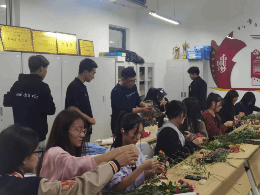十月秋风劲,校园热似火。为了激发学生们对运动会的热情和期待,展现了学院师生团结合作、奋发向前的精神风貌以及学校的团结和力量,特此,各社团干部在人工智能与大数据学院党总支书记兼学管副院长尹钧的带领下于2023年10月18日在次教216为运动会前筹备编织花环。