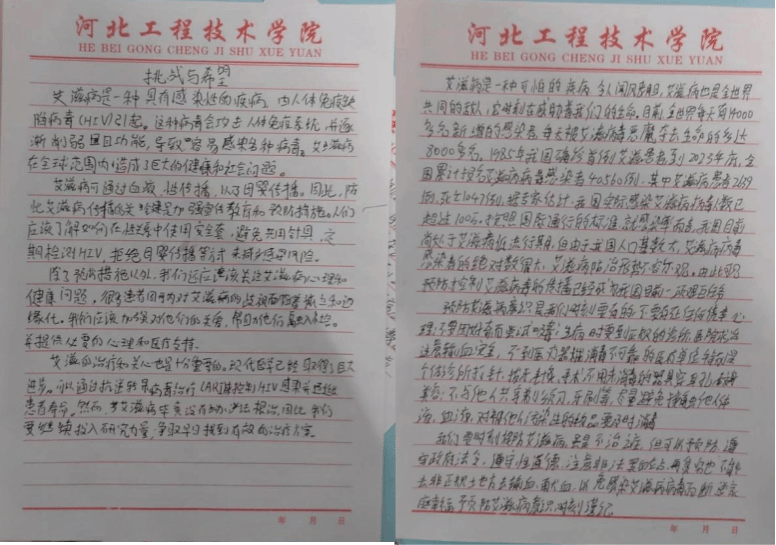 活动前期,通过摆放展板等方式在全院范围内进行禁毒防艾知识和此次征文比赛活动等的宣传,并将征文通知、撰写要求以及上交方式和时间一一进行传达。同时,鼓励同学们积极参与,用自身行动加入到“禁毒防艾”活动当中,提升同学的安全意识,努力同营造一个安全舒适的校园环境。