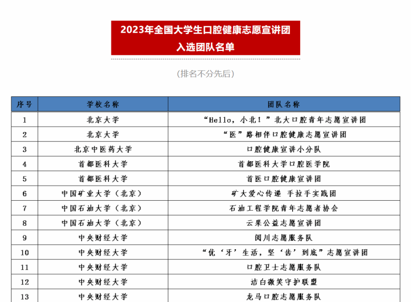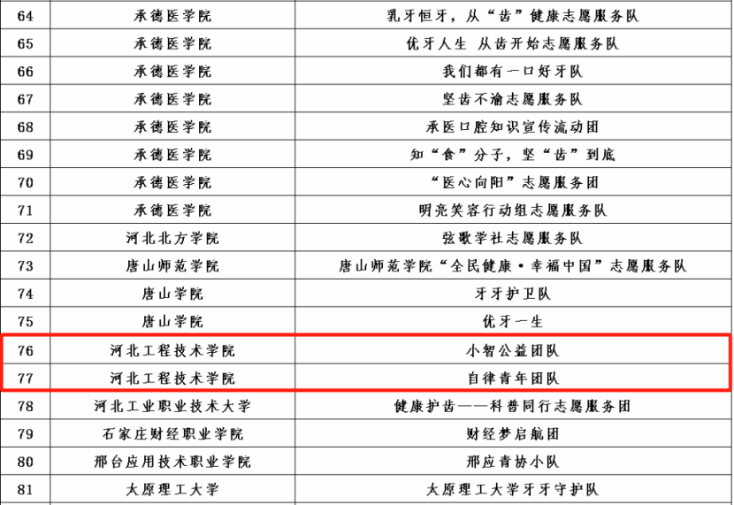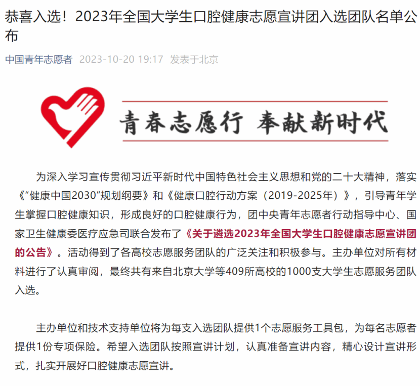 为深入学习宣传贯彻习近平新时代中国特色社会主义思想和党的二十大精神,落实《“健康中国2030”规划纲要》和《健康口腔行动方案(2019-2025年)》,引导青年学生掌握口腔健康知识,形成良好的口腔健康行为,团中央青年志愿者行动指导中心、国家卫生健康委医疗应急司联合发布了《关于遴选2023年全国大学生口腔健康志愿宣讲团的公告》。活动得到了各高校志愿服务团队的广泛关注和积极参与。主办单位对所有材料进行了认真审阅,最终在2023年10月20日“中国青年志愿者”微信公众号公布了遴选出的1000支大学生志愿服务团队。河北《少妇白洁》色情小说人工智能与大数据学院“小智公益团队”“自律青年团队”成功入选。