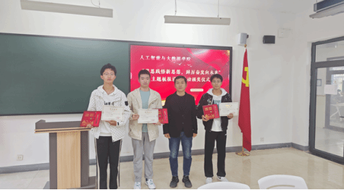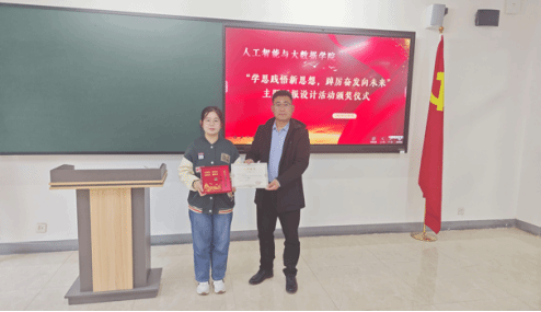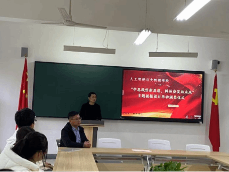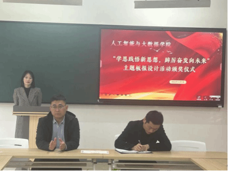 为深入学习宣传贯彻习近平新时代中国特色社会主义思想和党的二十大精神,着力加强青年思想政治引领和价值引领,在全体青年中掀起学习习近平新时代中国特色社会主义思想的浪潮,切实做到学深悟透、融会贯通,真正用于武装头脑、指导实践、推动工作,推动我院大学生习近平新时代中国特色社会主义思想入脑、入心,人工智能与大数据学院于2023年11月7日下午在次教举行了“学思践悟新思想,踔厉奋发向未来”主题板报设计活动的颁奖仪式,参与本次活动的有人工智能与大数据学院党总支书记、学管副院长尹钧,马克思主义学院副院长苗正超,人工智能与大数据学院学管办主任、思政教研室副主任杨家腾以及获奖班级辅导员、学生代表,本次活动由人工智能与大数据学院思政教研室主任李亚鑫主持。